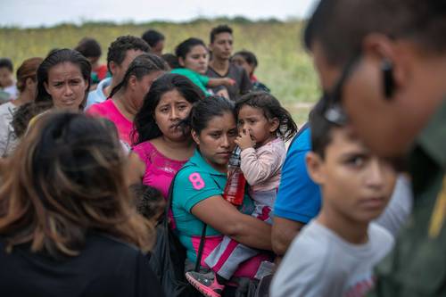 ▲ Un grupo de migrantes acata órdenes de la Patrulla Fronteriza en Los Ébanos, Texas, para ser trasladados a un albergue.